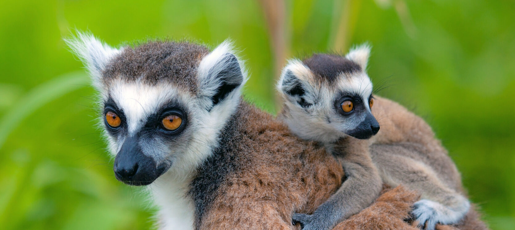 ¡Y no nos olvidemos de los lémures bebés! Las mamás se entregan al máximo y dedican todos sus cuidados y atenciones a sus bebés hasta que éstos desarrollan cierta autonomía. Las hembras catta que acaban de tener crías, las transportan sujetas en el pecho durante las 3 primeras semanas. Tras este periodo, las cargan a su espalda hasta que los bebés empiezan a ingerir alimento sólido. De esta manera, consiguen prestar todas las atenciones que los recién nacidos requieren sin descuidar su integración con el resto del grupo social.